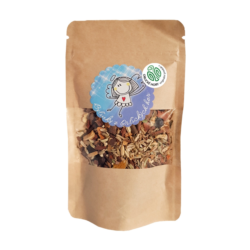 Skořice, pomerančová kůra, fenykl, jalovec, badyán, hřebíček, meduňka (sbíraná s ♥ v Orlických horách)